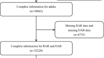 Trained research staff conducted face-to-face interviews to administer questionnaires, from which all information for diagnosing OAB was derived. To evaluate UUI, participants were asked: “During the past 12 months, have you leaked or lost control of even a small amount of urine with an urge or pressure to urinate and you couldn’t get to the toilet fast enough?”. The severity of UUI was assessed with the question: “How frequently does this occur?”. Regarding nocturia, participants were asked: “During the past 30 days, how many times per night did you most typically get up to urinate, from the time you went to bed at night until the time you got up in the morning?”. The responses were used to score the nocturia component of the OAB assessment.