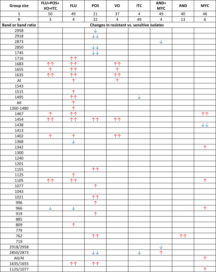 1. Statistically significant increases in the intensities of the analysed spectral parameters in isolates resistant to a given antifungal compared to sensitive ones are marked with red upward arrows, while decreases are marked with blue downward arrows. Differences significant at the level of p < 0.05 are indicated by double arrows and those significant at the level of p < 0.1 are indicated by single arrows. For each antifungal, the number of sensitive (S) and resistant (R) cases is provided.