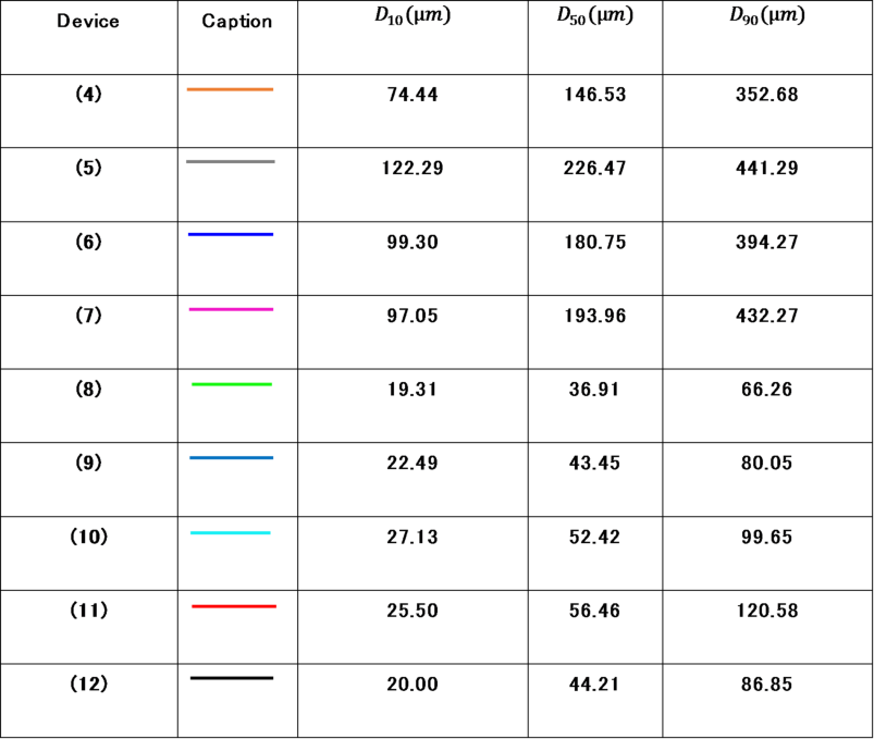Table 4 Results of \(\:{\text{D}}_{10}\:\) \(\:{\text{D}}_{50}\) and of \(\:{\text{D}}_{90}\) after spraytec analysis.\(\:{\text{D}}_{10}\left({\upmu\:}\text{m}\right),\:{\text{D}}_{50}\left({\upmu\:}\text{m}\right),\:\text{a}\text{n}\text{d}\:{\text{D}}_{90}\left({\upmu\:}\text{m}\right)\) were calculated using the spraytec software.