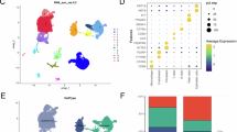 We next defined the cellular composition and molecular features of tumour cells and immune cells in the tumour microenvironment through single cell RNA-sequencing (scRNA-seq) analyses of three mouse ccRCC tumours derived from two untreated tumour-bearing animals. A renal cortex sample from an age-matched, Cre-negative animal served as a reference allowing assignment of cell cluster identities. Since flow cytometry revealed that immune cells typically represent < 10% of cells in cellular digests of mouse ccRCC tumours we used flow cytometric cell sorting to enrich immune cells from normal and ccRCC samples in the final sequenced population. After digestion of tissue samples, CD45.1+ immune cells were mixed in the ratio of 3:1 with CD45.1- cells for preparation of single cell libraries and sequencing. A total of 5151 cells with a median of 1713 identified genes per cell were analysed in the normal kidney sample and 5347 (median 1431 genes per cell), 5300 (median 1280 genes per cell) and 7823 (median 1127 genes per cell) cells were analysed in the three tumour samples, respectively. scRNA-seq datasets were pre-processed with scTransform, integrated and batch corrected using harmony. UMAP projection identified 18 clusters (clusters 0–17) (Fig. 4a and Supplementary Fig. 1a). We combined cluster-specific differential gene expression analyses with cellular lineage markers that were identified in previous scRNA-seq studies of resident renal cells23,24, our previous bulk RNA-seq studies of the mouse ccRCC model19,20, and well-established marker genes to annotate clusters (Fig. 4a, Supplementary Fig. 1b, Supplementary Fig. 2). Four clusters (5, 8, 10, 14) were excluded from further analyses based on high mitochondrial gene content, likely reflecting dying cells or cells that were damaged during the steps of processing for scRNA-seq. Cluster identities were confirmed with multiple marker genes for each cluster.