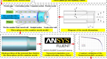 The spray formation region is where the liquid jet experiences its primary and secondary breakup processes, resulting in the formation of a spray of droplets, as shown in Fig. 7. This region typically begins immediately after the liquid exits a nozzle or orifice and extends through the initial stages, during which the jet becomes unstable and starts to develop droplets. Aerodynamic forces including shear of surrounding air and of a liquid and the relative velocity of liquid and air are all important in the droplet breakup process in this region. These factors allow ligaments to separate into small droplets. The spray formation zone is characterized by different droplet sizes which is affected by various factors such as nozzle design properties of the fluid (viscosity, surface tension) and the air surrounding the fluid. The liquid’s end of this region is when the liquid has been fully atomized into small droplets and uniform to serve the intended application, for example fuel spray in internal combustion engine, agricultural spraying, or spray coating. The influence of V-cut depth and pressure on spray angle and sheet length was investigated in this study to understand better their impact on spray characteristics seen in Table 3; Fig. 9 respectively. To examine these parameters in detail, a high-speed camera was employed, as discussed in section “Spray angle and sheet length measurement methodology”. The spray characteristics from five different V-cut depths were analyzed at three different pressures—100 kPa, 200 kPa, and 300 kPa—to provide a comprehensive understanding of their effects. Results showed that the A2 model nozzle had a significantly lower spray angle, which can be attributed to the specific geometry of the V-cut. The V-cut angle in the A2 nozzle was 76°, resulting in a disturbance in the atomization process and improper droplet breakup. The resulting phenomenon is jet like behavior rather than the expected fan shaped spray pattern. The V shaped cutting angle is too shallow to disturb the liquid stream properly, resulting in the formation of a liquid jet and preventing proper atomization of spray. On the other hand, the spray angle increased progressively with the increase of the V-cut depth. This result is logical, as a improve V-Cut depth in nozzle permits more divergence of the fluid stream as it leaves the nozzle, scattering the liquid over a further area and increasing the spray angle. Figure 8; Table 2 demonstrate this correlation between increased V-cut depth and a broader spray angle. The study also showed a strong correlation between V-cut depth and sheet length. The experimental results showed that the sheet length was obtained maximum of 64 ± 4 mm with the A2 nozzle at 100 kPa pressure. The reason is that the fluid stream exits the nozzle with a lower velocity at lower pressure, and the fluid stream travels a long distance before forming droplets. However, as the pressure was increased, the spray sheet length decreased, with values ranging from 48 mm ± 4 to 45 ± 4 mm as pressure increased from 100 kPa to 300 kPa. There is a well-known phenomena that occurs when the sheet length decreases as the pressure increases. This is because an increase in pressure resulted higher velocity at the nozzle exit position. The high exit velocity leads to faster droplet breakup and hence reduced length of the spray sheet. Additionally, the increased velocity also decreases spray effective distance, allowing droplets to spread out more rapidly.