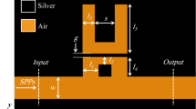 The values of \(\:{\lambda\:}_{1}\) and \(\:{\lambda\:}_{2}\) are the high and low cut-off wavelengths, which are − 3dB, respectively. Two new stubs are used to create the filter, which has final dimensions of 200 nm × 420 nm. Importantly, for the passbands, the transmission rate reaches 98.5%, while in the cutoff bands, this value approaches zero, making it suitable for attaining great selectivity and efficiency.