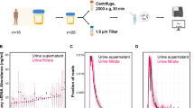 The performance of the in-house Q Sepharose-based extraction method (Qseph) was evaluated through the relationship between urinary input volume, cfDNA yield, size distribution of cfDNA, and copies of the autologous reference gene AGO1 measured with ddPCR. A significant positive correlation was observed between the urinary input volume (10–50 mL) and the total cfDNA yield (r = 0.995, p < 0.001, Supplementary Fig. S1). Similarly, we found a strong linear correlation between the urinary input volume and the total AGO1 copies of the eluate (r = 0.999, p < 0.001). The size distribution pattern was independent of urinary input volume (Supplementary Fig. S2).