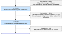 To mitigate the influence of confounding variables on mental disorders and BRI level, various covariates were integrated into the statistical models. These covariates encompassed age, sex, IMD, educational level, income level, healthy lifestyles (never smoking, no heavy alcohol intake, healthy sleep patterns, healthy diet, and regular physical activity), prevalent diseases (hypertension and diabetes), blood pressure (systolic blood pressure and diastolic blood pressure), metabolic biomarkers (glucose, hemoglobin A1c, high-density lipoprotein, low-density lipoprotein, total cholesterol, and triglycerides), and medication use (opioids and non-steroidal anti-inflammatory or antirheumatic drugs [NSAID]). The IMD was utilized to assess social deprivation at the neighborhood level, encompassing seven distinct domains, which include health, education, income, employment, crime, barriers to housing and services, and living environment59. Educational level was categorized into “high” and “low” groups for analysis. Participants with qualifications such as College or University degree, National Vocational Qualification (NVQ), or professional certifications were classified as the “high” group. Those with lower qualifications, including Advanced Levels (A levels), General Certificate of Secondary Education (GCSEs), Certificate of Secondary Education (CSE), or no formal qualifications, were classified as the “low” group. Participants’ income level was divided into high and low groups based on the median value (cut-off: £ 3100). Never smoking was defined as a binary classification: individuals categorized as “Yes” had no history of smoking at baseline, while those categorized as “No” included both current and former smokers. No heavy alcohol intake was defined as the average daily intake ≤ 16 g of pure alcohol (2 units of alcohol) for both men and women. Regular physical activity was assessed according to the American Heart Association’s guidelines, which recommend engaging in a minimum of 150 min of moderate-intensity exercise or 75 min of vigorous-intensity exercise (or an equivalent combination) per week60. A healthy diet was characterized by the consumption of at least four out of seven food groups that are commonly recommended as dietary priorities for cardiometabolic health. Healthy sleep patterns was characterized by meeting at least four out of five criteria for healthy sleep behaviors, which included: an early chronotype; sleeping 7 to 8 h per day; experiencing insomnia rarely or never; not self-reporting snoring; and dozing off during the day rarely or never. A detailed list of included medications is provided in Supplementary Table 13.