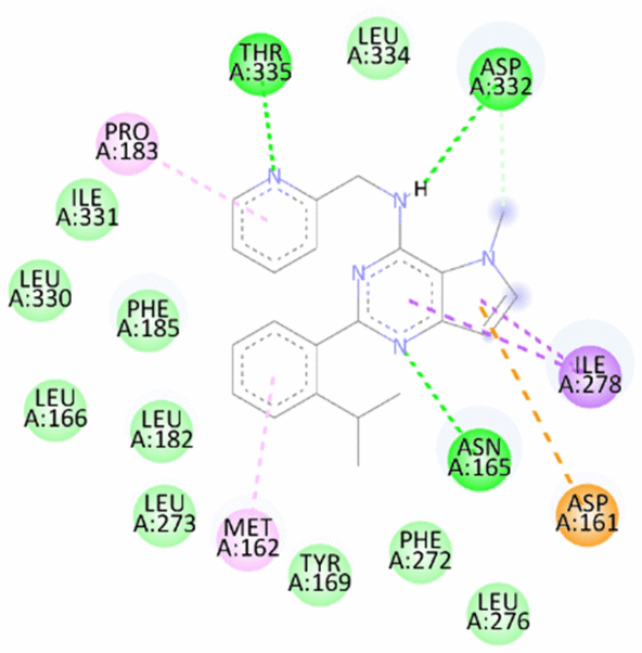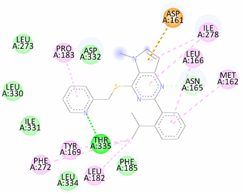 1 | DVF 2-(2-isopropylphenyl)-5-methyl-N-(pyridin-2-ylmethyl)-5H-pyrrolo[3,2-d]pyrimidin-4-amine | -9.26/-10.4 | Hydrogen bond- Asn165, Asp332, Thr335 Pi Anion- Asp161 Pi Sigma- Ile278 Pi Alkyl- Met162, Pro183 | |