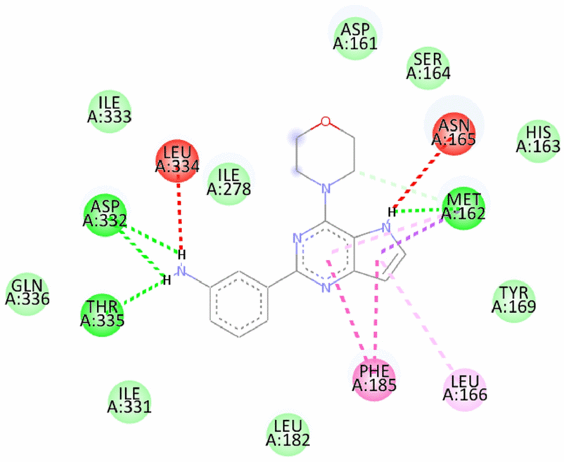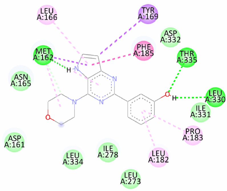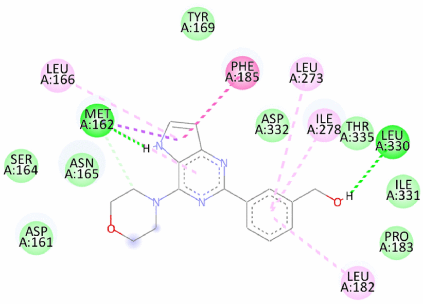 12 | 3-(4-morpholino-5H-pyrrolo[3,2-d]pyrimidin-2-yl)aniline | -7.06/-8.0 | Hydrogen bond- Met162, Asp332, Thr335 Pi Sigma- Met162 Pi-Pi T shaped- Phe185 Pi Alkyl- Leu166 |