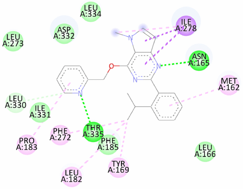 4 | 2-(2-isopropylphenyl)-5-methyl-4-(pyridin-2-ylmethoxy)-5H-pyrrolo[3,2-d]pyrimidine | -9.07/-9.9 | vdW and Carbon Hydrogen bond- Leu330 Hydrogen bond- Asn165, Thr335 Alkyl Pi Alkyl- Met162, Tyr169, Leu182, Pro183, Phe272 Pi Sigma- Ile278 | |