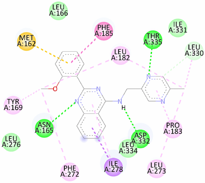 6 | 2-(2-methoxyphenyl)-N-((5-methylpyrazin-2-yl)methyl)quinazolin-4-amine | -8.48/-9.6 | Carbon Hydrogen bond- Leu330 Hydrogen bond- Asn165, Asp332, Thr335 Pi Sigma- Ile278 Pi-Pi Stacked- Phe185 Pi Sulfur- Met162 Alkyl and Pi Alkyl- Tyr169, Leu182, Pro183, Phe272, Leu273 | |
