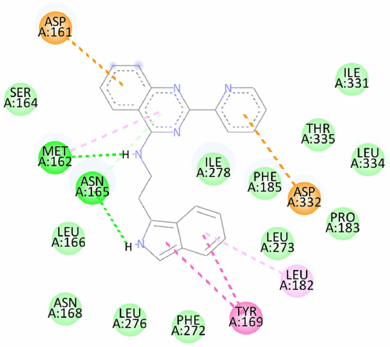 7 | N-(2-(2H-isoindol-1-yl)ethyl)-2-(pyridin-2-yl)quinazolin-4-amine | -9.35/-10.0 | Hydrogen bond- Met162, Asn165 Pi Anion- Asp161, Asp332 Pi-Pi Stacked-Tyr169 Pi Alkyl-Leu182 | |