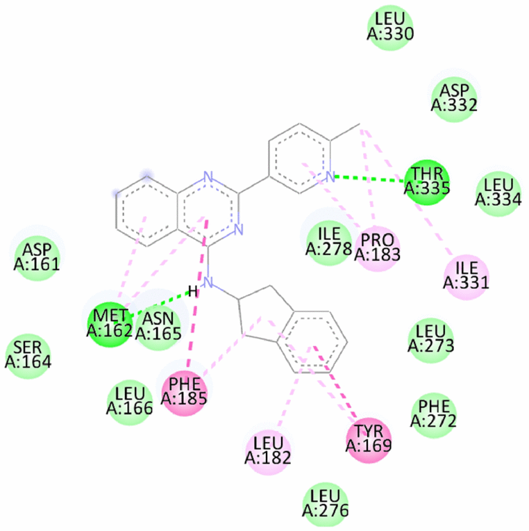 8 | N-(2,3-dihydro-1H-inden-2-yl)-2-(6-methylpyridin-3-yl)quinazolin-4-amin | -9.75/-10.9 | Hydrogen bond- Met162, Thr335 Pi-Pi Stacked and Pi Pi T Shaped- Tyr169, Phe185 Alkyl and Pi Alkyl- Leu182, Pro183, Ile331 | |