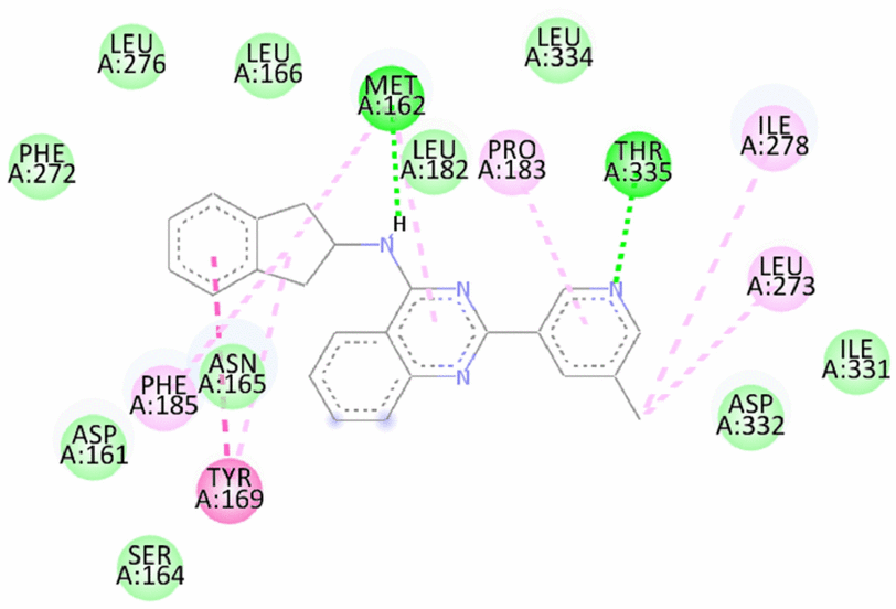 9 | N-(2,3-dihydro-1H-inden-2-yl)-2-(5-methylpyridin-3-yl)quinazolin-4-amine | -10.0/-11.1 | Hydrogen bond- Met162, Thr335 Pi Pi Stacked- Tyr169 Alkyl and Pi Alkyl- Pro183, Phe185, Leu273, Ile278 | |