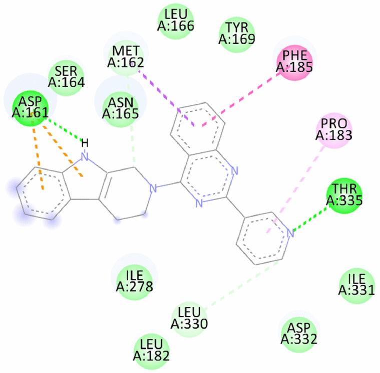 10 | 2-(2-(pyridin-3-yl)quinazolin-4-yl)-2,3,4,9-tetrahydro-1H-pyrido[3,4-b]indole | -9.11/-10.2 | Hydrogen bond- Asp161, Thr335 vdW and Carbon Hydrogen bond- Asn165, Leu330 Pi Sigma- Met162 Pi Pi T shaped- Phe185 Pi Alkyl- Pro183 Pi Anion- Asp161 | |