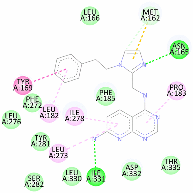 11 | N4-((1-phenethyl-1H-imidazol-2-yl)methyl)pyrido[2,3-d]pyrimidine-4,7-diamine | -8.86/-9.3 | vdW and Carbon Hydrogen bond- Met162 Hydrogen bond- Asn165, Ile331 Pi Pi Stacked- Tyr169 Hydrogen bond- Asn165, Ile331 Pi Alkyl- Leu182, Pro183, Leu273, Ile278 | |