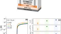 Figure 5a shows the simulated current ratios using the interface trap density extracted by SPCP as input parameters (green symbols and line). Simulations including the high Dit of the HfO2 GI device now reflect the experimental results. To further investigate the effect of interface traps on the device performance, we analyse the simulated device. Figure 5b–d shows the 1D cut lines in the x and y directions (defined in the inset of Fig. 5b). Electron concentration, electron velocity, and E-field were compared at different interface trap densities. Both the electron velocity and the E-field at the interface decrease as the interface trap increases. As the Fermi level passes through the energy range of interface trap states, the rate of surface potential (\(\:{\psi\:}_{s}\)) change in response to the gate voltage slows as electrons are filling the interface states, which can be modeled as an interface trap capacitance (Cit)21. Since Cg is a series connection of Cox and Cs + Cit (see Supplementary Fig. S2), the increase in interface traps requires filling, which in turn lowers \(\:{\psi\:}_{s}\) at a given gate voltage. Hence, the field across Cox is reduced, carrier velocity is lowered, and reaching an equal amount of carrier concentration would require a higher gate voltage. Hence, degradation in transconductance occurs. This contrasts with the influence of oxide charge, where ID degradation is caused by a parallel shift in Vth25. Figure 3a supports the effect of interface traps, as it is evident that there is no Vth shift with Dit change, and the transconductance is reduced due to higher Dit.