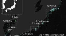 The final tsunami source model, corrected for modeling errors in phase and amplitude, is shown in Fig. 2. Off the northeastern coast of the Noto Peninsula, uplift peaks of up to 3.3 m and 3.0 m were estimated at locations corresponding to NT5 and NT4, respectively. Another uplift peak of up to 2.6 m was estimated near the boundary between NT3 and NT2. This location corresponds to a region with a characteristic steep topography, where contour lines bend in a northwesterly direction (Supplementary Fig. S3). On land, two uplift peaks were identified: one of 3.3 m in the westernmost part of NT6 and another of 1.8 m in the eastern part. The Pearson Correlation Coefficients (PCCs) between the observed and estimated waveforms are shown in the middle panels of Fig. 2. PCC values range from –1 to + 1, with values closer to 1 indicating better agreement between observed and estimated waveforms. Positive correlations were observed at all points. The waveforms calculated for each observation point using the nonlinear long-wave model generally reproduced the characteristics of the observed waveforms. The observed and estimated trace heights also showed good agreement, with Aida42’s geometric mean \(K\) of 0.99 and geometric standard deviation \(\kappa\) of 1.29, as shown in the bottom panel of Fig. 2. In the final model, the ratio of observed to model trace heights is close to unity; however, in the lower panel of Fig. 2, the blue markers show a slight tendency toward overestimation. This area—known as Shiromaru—experienced locally elevated tsunami heights and extensive inundation damage10. Shiromaru is a small, isolated bay with a narrow mouth of roughly 300 m, and a 50 m grid spacing in the model likely provided insufficient resolution, which may have introduced this bias. Validation using higher-resolution bathymetric data remains a task for future work.