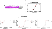 Immunohistological analysis of the three corneal models showed a clear correlation between UV-induced DNA damage and epithelial thickness. To better estimate the light penetration depth in an intact human cornea with normal epithelial thickness, the optical properties of the porcine cornea, specifically absorption (µa) and effective scattering coefficients (µs’), were determined (Fig. 6). A total of n = 3 porcine corneas were analyzed, with n = 4–6 thin sections per cornea for the stroma and n = 1–3 thin sections for the epithelium.