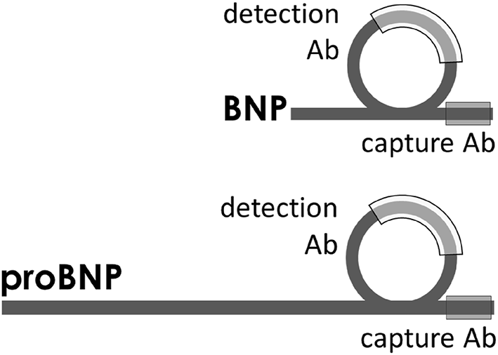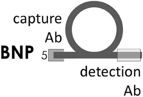 Intact-ring BNP s-IA | Antigen: BNP and proBNP with ring structure intact within aar 14–21 of BNP (90–97 of proBNP) Capture: mAb 50E1 (BNP aar 26–32, proBNP aar 102–108) Detection: mAb BNP130 (BNP aar 14–21, proBNP aar 90–97) | |