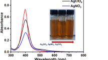 Absorption spectra of PVA/Cs/Ag nanocomposites displayed a noticeable increase in the absorbance followed by a red shift of SPR peak to the high wavelength from 433 to 441 nm. This shift in the SPR band depends mainly on the particle shape and size35. It is previously published in other studies that the SPR peak shifts to higher wavelengths due to increased particle size resulting from particle aggregation36. Our results are in good agreement with what is previously published regarding the dependence of the SPR peak position on the size of silver nanoparticles37,38. Amirjani et al. reported that a red shift in the position of SPR peak from 390 to 460 nm with variation in the size of Ag nanoparticles37. Alzoubi et al.reported that shift in SPR peak position depends mainly on the size of NPs and their shape38. The broadening of SPR band indicates that the AgNPs are polydispersed in the matrix of PVA/Cs blend. This band is ascribed to the spherical colloidal AgNPs absorption because of excitations of surface plasmon vibration35. It is observed that the higher the content of AgNPs, the greater the intensity of absorption, which enhanced the surface area due to the nano-size of Ag, and thus strong absorption is obtained36. Consequently, as a result of the above results, these nanocomposites can be used in the applications of UV shielding.