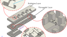 Over the years, various strategies have been employed to overcome challenges of designing waveguide-based 45° slant-polarized antenna arrays. For example, the XPD has been improved by increasing the thickness of the radiating slots or by adding an additional narrow-slot pair layer on top of the radiating slot layer14,15. However, this results in increasing the number of layers and complexity of the antenna structure. An alternative approach, proposed in17, involves the insertion of metal blocks into the cavity layer to suppress grating lobes and enhance XPD. However, this method results in a reduction of the antenna array bandwidth to 18.8%. More recently, a vertical power divider consisting of H- and E-plane T-junctions was utilized to replace the conventional cavity-backed power divider18. This design improves the grating lobes in E- and H-planes and XPD to around 25.6 dB and 45.8 dB, respectively, over the frequency range of 24–33 GHz (31.5%), without the need for additional metal layers. Gap waveguide technology, introduced in 2009, offers a low-loss and effective alternative to hollow waveguides, addressing their shortcomings by eliminating the need for electrical contact between the structure’s metal layers21. A survey of literature reveals that several 45° slant-polarized antenna arrays, based on gap waveguide technology, have been proposed in recent years22,23,24,25,26. In22, 10° tilted radiation slots were utilized to suppress the grating lobes in E- and H-planes. However, this approach had significant limitations. It achieved only a 17.6% fractional bandwidth, and as the rotation angle of the radiation slots increased, both the grating lobe level and XPD deteriorated. A 45° slant-polarized wideband 8 × 8-element slot array antenna with a ridge gap waveguide-based corporate-feed network was presented in23. That antenna exhibited a fractional bandwidth of 26.4%, the peak gain of 24.6 dBi, the efficiency more than 76.3%, the SLL of −25.8 dB and XPD better than 30.2 dB. The main drawback of that antenna is its multi-layered and complex structure. More recently, a V-band 45° linearly polarized 8 × 8-slot array antenna, incorporating a broadband groove gap waveguide-based corporate-feed network, was introduced in26. This antenna demonstrated an impressive fractional bandwidth of 23.8%, achieving a peak gain of 27 dBi, an efficiency exceeding 92%, SLL of −25.8 dB, and XPD surpassing 40 dB.