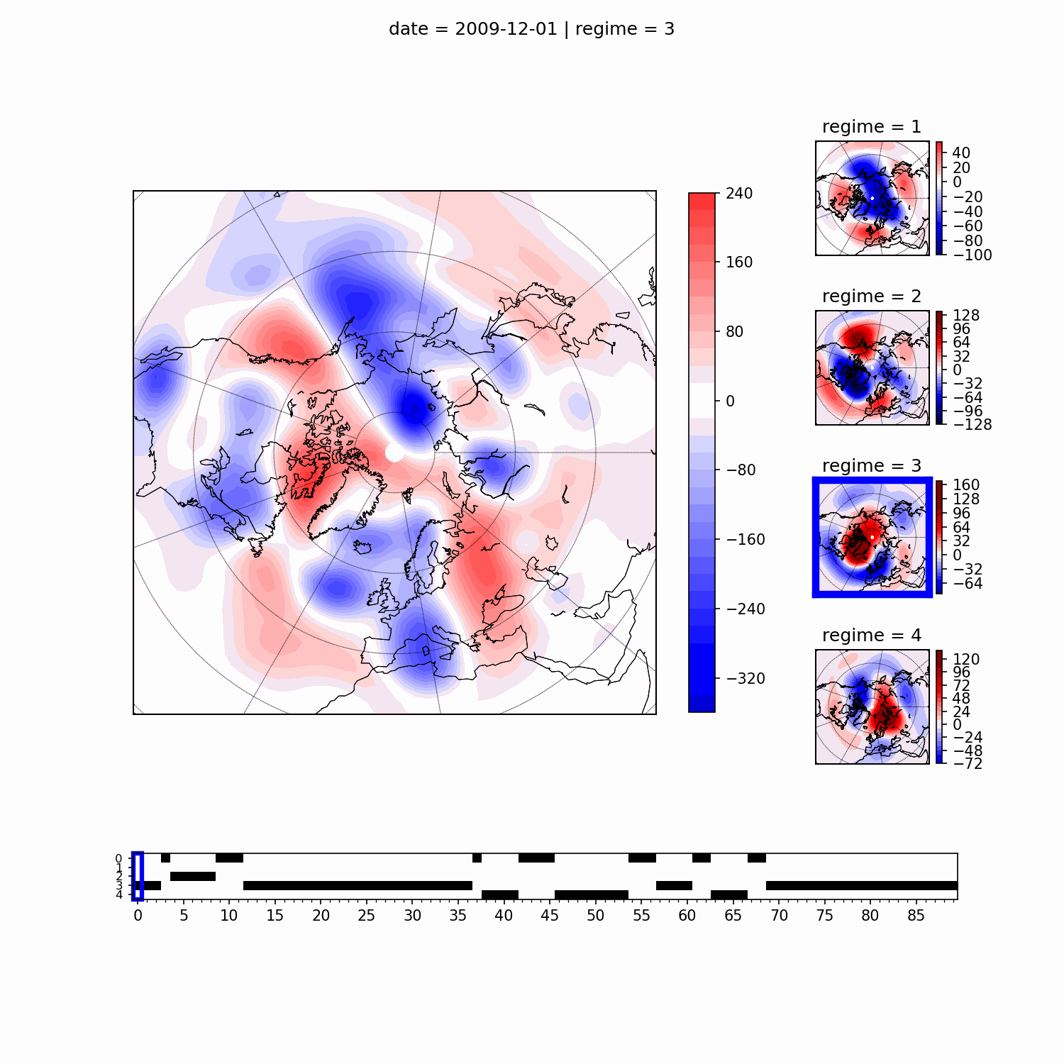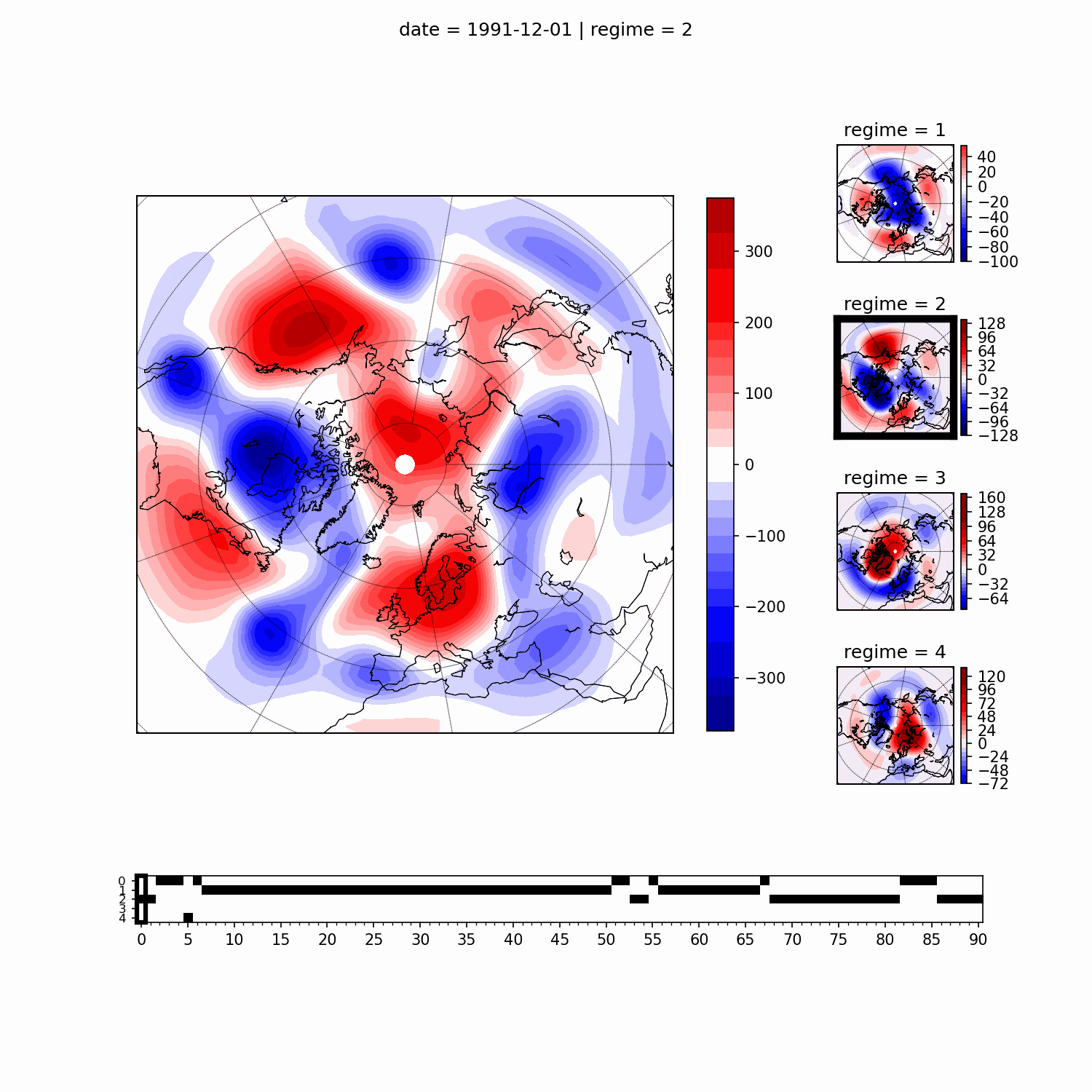 Here, to get anomalies associated with states \(A_k\), we compute a composite pattern \(\left<\textbf{Y}|A_k\right>\), that is the mean of observed value \(\textbf{Y}\) given \(A_k\) via the obtained estimates of \(P(J=j|\textbf{Y}_t)\), i.e. probability that the observation \(\textbf{Y}\) at time t belongs to the hidden state \(J=j\) (see sec. 1.1). For each \(\textbf{Y}_t\), the regime occupation probability is first calculated: