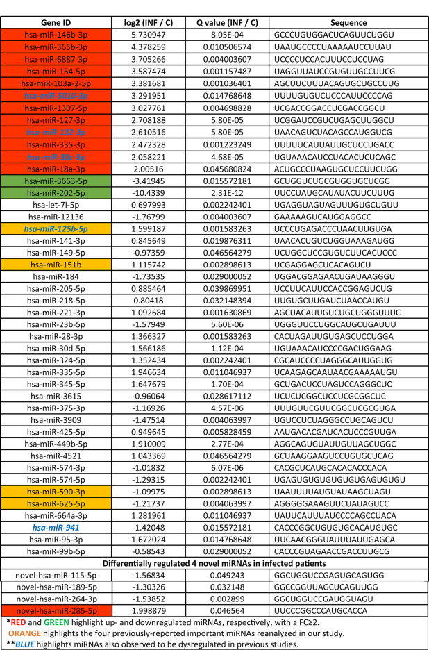 Table 4 Differentially regulated known MiRNAs (n = 44) in infected patients (FC ≥ 0.5, Q < 0.05)*, **.