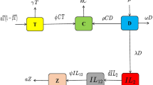The system above represents logistic tumor development as \(aT (1 - bT )\), tumor death produced by NK as \(-cNT\), tumor death caused by CD8+T cells as \(-DT\), and chemotherapy-driven tumor death as \(-K_T (1 - e^{-M})T\). eC represents the generation of natural killer cells from circulating lymphocytes; \(-fN\) denotes natural killer breakdown; \(-pNT\) denotes natural killer death due to tumour killing exhaustion; and \(-K_N(1 - e^{-M}))N\) represents the chemotherapy-induced NK death, while \(\frac{g T^2}{h + T^2}\) represents the NK cell recruitment. Whereas \(-qLT\) denotes CD8+T cell death from running out of tumor-killing resources, \(-mL\) represents CD8+T cell breakdown. \(r_1NT\) represents the stimulation of CD8+T cells by NK-lysed tumour cell debris, \(r_2CT\) represents the interactions between the tumor with C cells that stimulate CD8+T production, \(\frac{p_1 L I}{g_1 + I}\) IL-2 also known as interleukin-2, has a stimulatory effect on CD8+T cells. \(-K_L(1 - e^{-M})L\) is CD8+T death brought on by chemotherapy. \(-uNL^2\) represents the CD8+T cell’s quadratic death rate. \(j \frac{D^2 T^2}{k + D^2 T^2} L\) is the CD8+T cell, the controlled external Tils (tumour infiltrating lymphocytes) is \(V_L(t)\). \(-\beta C\) represents lymphocyte breakdown, \(\alpha\) denotes a steady source rate, and \(-K_C(1 - e^{-M})C\) stands for chemotherapy-induced leukaemia. Chemotherapy medication breakdown is expressed as \(-\gamma M\), and external chemotherapy controlled as \(V_M(t)\). The IL-2 breakdown is \(-\mu _I I\), external IL-2 controllable is \(V_I(t)\) and parameters values for analysis are given in Table 1.