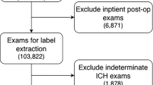 Currently, various predictive scores, including clinical variables, laboratory markers, noncontrast CT (NCCT) markers, and CT-angiography (CTA) spot signs, are used to identify the risk of ICH growth2. A clinical prediction score (BRAIN) developed from simple variables achieved good predictions (C-statistic, 0.73) in estimating the probability of ICH growth3. A large meta-analysis revealed that models incorporating additional CTA spot signs had greater overall discriminative ability11 but CTA availability is not standardized in acute settings12. Although NCCT-based imaging markers may serve as reliable substitutes for CTA spot signs13 they are limited by experience dependence, prone to inter- and intrareader variability, and are too time-consuming for routine clinical use. Machine learning (ML) aided diagnosis models have received significant attention in medical imaging14,15 and their application in predicting cHE has demonstrated promising preliminary results16,17. Compared with traditional ML, deep learning allows end-to-end prediction and classification by automatically learning the semantic and spatial features from raw input image pixels without relying on human-designed, engineered features18. Zhong et al.‘s study applied an end-to-end convolutional neural network (CNN) model using NCCT images from 266 patients to predict cHE, achieving a high C statistic of 0.80 and demonstrating superiority to NCCT markers alone19. Recently, Li et al. used a large dataset to develop a two-stage framework for predicting cHE, achieving an AUC of 0.806 in a prospective set20. Moreover, Tran et al.‘s study, which was based on a relatively small dataset (n = 793), also developed a model to predict cHE, achieving a similar AUC of 0.80 with NCCT images21. These studies highlight the ability of deep learning to identify the risk of cHE. However, they did not assess the dynamic evolution of IVH during follow-up, a process may lead to obstructive hydrocephalus requiring external ventricular drainage22,23.
