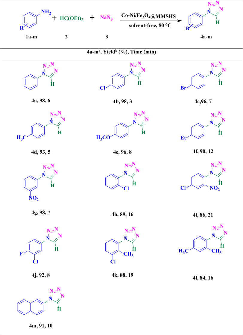 Table 3 Synthesis of 1-substituted 1H-1,2,3,4-tetrazole derivatives using Co–Ni/Fe3O4@MMSHS as a nanocatalyst. aReaction conditions: 1 mmol of aromatic amine, 1 mmol of sodium azide, 1.2 mmol of triethyl orthoformate, and 6 mg of Co-Ni/Fe3O4@MMSHS as a catalyst under solvent-free conditions at 80 °C. bIsolated yield.