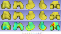 Therefore, 122 MRI images from 121 patients of OA femurs (sex ratio 41/81 [male/female]; age 66.3 ± 12.0 [mean ± standard deviation]; side ratio 62/60 [right/left], including both sides of the knees in one patient) were used in the study. These data were subsequently categorized into OA severity groups for each knee compartment: medial, lateral, and P-FT. The categorization of OA severity per compartment was based on the total MOAKS score (osteophytes, bone marrow, and articular cartilage lesions)9. The patients were divided into two groups according to the severity of OA in the lateral and P-FT compartments. For comparison, the data were divided into three groups for the medial compartment because OA severity varied from mild to severe. In addition, the total knee OA severity was classified into three groups according to the K-L grade (K-L grades 2–4). OA severity was categorized independently by two radiologists (the same radiologists who delineated the distal femur and proximal tibia), and a consensus was subsequently reached.