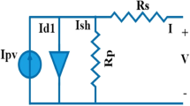 The equivalent circuit of the one-DM is shown in Fig. 1. According to Kirchhoff’s Current Law Concept (KCLC), the output current of the solar cell can be expressed as a function of output voltage (Vo), and the reverse saturation current (IR₁) as described in Eq. (1)56. Additionally, the thermal voltage (Thv) of the cell is derived using cell temperature (T) and Boltzmann’s constant (k = 1.3806503 × 10⁻²³ J/K). The Shockley diode equation incorporates the elementary charge (q = 1.60217646 × 10⁻¹⁹ C) to quantify electron charge.
