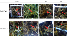 On each experimental platform we transplanted two exposed and two caged A. pulchra nubbins (n = 10 per treatment at each site). All corals were collected over a period of 2 days from the same large thicket of A. pulchra at a single lagoon site on the northwest shore of the island (Fig. 1e), and thus it was assumed that all colonies came from the same putative genotype. Corals were collected the day before deployment using bone cutters to separate a single branch tip (henceforth referred to as a “coral”) from the colony. Each coral was placed into an individual resealable bag filled with seawater, placed into a cooler, and transported to flow-through seawater tables in the laboratory. On the same day of collection, each coral nubbin was secured in a 3 cm section of a 50 mL centrifuge tube using a two-part marine epoxy. Each coral was individually numbered using underwater paper placed inside the centrifuge tube. We estimated coral growth using two metrics: total linear extension (cm TLE; i.e., the sum of all branches) and buoyant weight (grams)71. On the day of deployment, the mean (± SE) height of nubbins was 5.83 cm (± 0.05) and the mean mass was 10.76 g (± 0.10). On the day following collection, coral nubbins were randomly assigned to treatment and transplanted to experimental platforms in a random, pre-determined design. Experimental corals were checked every 5 to 7 d to ensure that platforms were intact and cages remained closed and to record observations of corallivory, paling, or any other changes in the corals. At the conclusion of the experiment (October 1 and 3, 83 d after initiation) we photographed all corals in situ, visually estimated partial mortality (i.e., skeletal area with no live tissue), and measured them for buoyant weight and total linear extension in the laboratory to quantify changes in skeletal mass, height, and total linear extension.