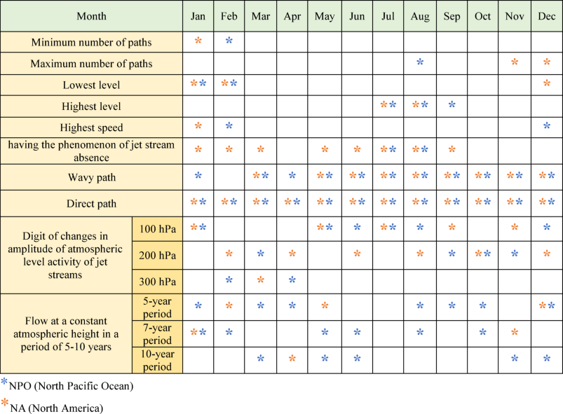 Table 1 Information and attributes of the jet stream during four decades in the NA and NPO.