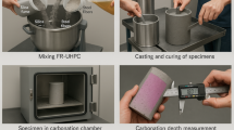 As in Fig. 2, a dense UHPC blend featuring Portland cement, silica fume, fine quartz or silica sand (< 2 mm), and, when specified, fly ash was prepared according to defined target proportions. The dry constituents (cement, silica fume, and fly ash) were mixed together for 2–3 min to achieve uniform dispersion. About 80% of the total water was introduced at low speed to dampen the fine powders. The superplasticizer was pre-diluted in the remaining water and added gradually over the next 2–3 min, until the blend reached the desired cohesive and highly deformable mortar consistency. Fresh mix temperature was controlled to remain below 30 °C by pre-cooling aggregates or by incorporating chilled mixing water. The workability was checked using a mini-slump or flow spread procedure tailored for UHPC, and any fine-tuning of consistency was carried out by varying the superplasticizer dosage, ensuring that the water-to-binder ratio (w/b) remained unchanged.