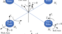 where \(f_{1,i}\) and \(\omega_{l,i}\) denote the lift force and speed of each rotor. \(L_{i}\) signifies the distance separating the motor from the mass center. \(\kappa_{i}\) and \(k_{i}\) are aerodynamic coefficients, respectively. \({\mathbf{R}}_{i} \left( {{{\varvec{\Theta}}}_{i} } \right)\) and \(\Pi_{i} \left( {{{\varvec{\Theta}}}_{i} } \right)\) represent the rotation matrix and attitude motion matrix, i.e.,