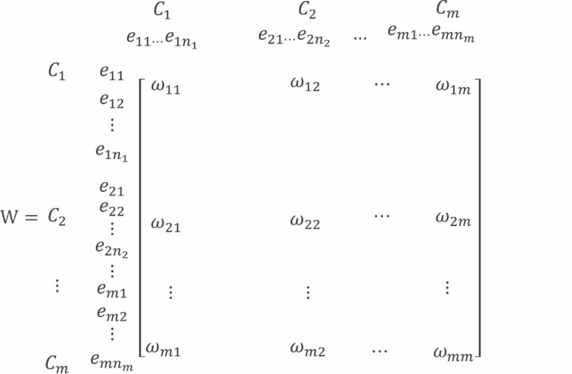 It is essential to accurately assess indicators at a multi-level for deriving the weighted super-matrix because the unweighted super-matrix is developed without taking influences among clusters. Equation (11) utilizes cluster taking as a variable and compares relative weights pairwise to construct a relative weight matrix C. Consequently, the weighted super-matrix W is developed by applying Eq. (12) by combining the relative weight matrix C and unweighted super-matrix W