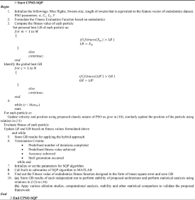 \(\:{P}_{e}=\:\left(\frac{\left(TP+FP\right)\left(TP+FN\right)+\left(FN+TN\right)\left(FP+TN\right)}{{\left(TP+TN+FP+FN\right)}^{2}}\right)\)The proposed training algorithm CPSO-SQP is give below in the form of pseudocode: