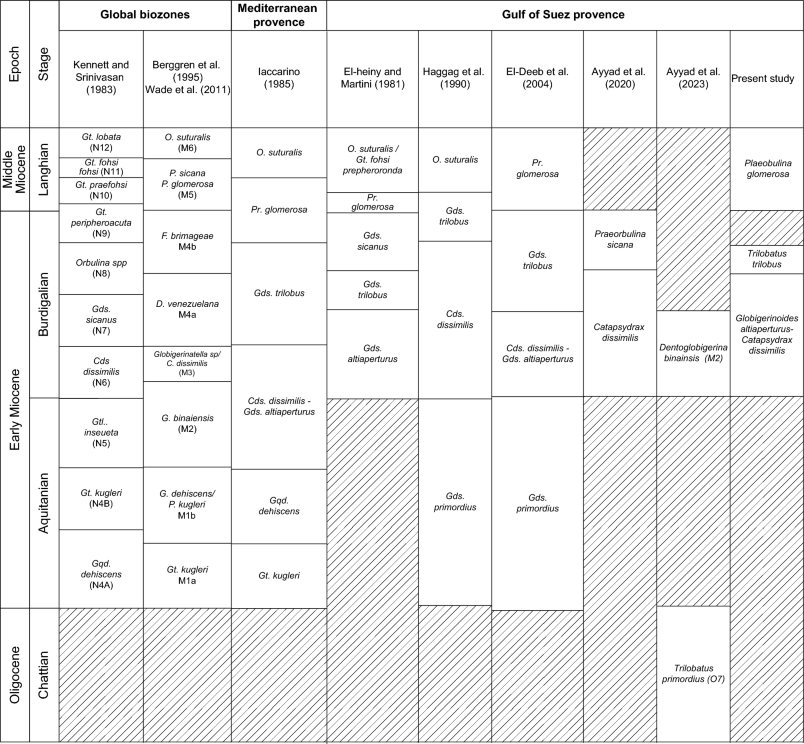 Table 2 Comparison of the planktonic foraminiferal zones of the Late Oligocene-Middle Miocene syn-rift succession in the Gulf of Suez Basin, Mediterranean province and global equivalents.