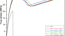 where \({W}_{a}\) a is the actual mass fraction of bulk and nanofiller, \({\Delta H}_{0}\) is the heat of fusion of 100% crystalline polypropylene (\({\Delta H}_{0}\)= 207 J⋅g-173), \({X}_{C}\) is the crystallinity of the semi-crystalline polymer, and \(\Delta H\) is the heat of fusion of the semi-crystalline polymer and its composites.