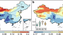 Here, \(\theta (t)\) represents the soil water content at time t, \(\Delta \theta\) is the increase of soil water content caused by the weather event, \(\theta _{f}\) is the estimated lower bound of the soil moisture observations, and \(\omega\) is the “temporal e-folding decay”, which describes the time it takes for the soil water content to drop to \(\frac{1}{e}\) of its initial level18. Prior studies have typically focused on the spatial and temporal variations in the estimated drydown parameter \(\omega\)25,26,27,28, and the results are often presented as (seasonal) maps of the estimated e-folding time scale.