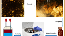 Once aged, samples were centrifuged at 4000 rpm in 5-minute intervals until clear separation of oil, water, and solids was observed. Separated emulsions were then stored at 25 °C in a dark chamber for 24 h to stabilize the separated phases before analysis. The emulsion eventually separated into three distinct phases: oil, water, and solids. It is important to mention that the solid phase mainly consisted of calcite particles with adsorbed asphaltenes, as well as aggregates of unstable asphaltenes that precipitated during the aging process. The volumes of the solid and oil phases were measured to evaluate the overall stability of the emulsion39.