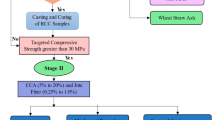 A reference mix was formulated following ACI 211.1–91 standards. Using Design Expert software version 13, mix designs with different POFA and JF contents were established. By using Response Surface Methodology (RSM), the study identified an optimal experimental design to assess the effect of POFA and JF on concrete properties and create predictive models for strength variation. This study involved two independent variables, POFA and JF, with POFA percentages in the range from 0 to 25% and JF from 0 to 0.5%. The upper limit for JF was selected because multiple studies have reported that increasing jute fiber content above 0.4–0.5% by volume leads to a decline in mechanical strength, workability, and fiber dispersion due to agglomeration and increased porosity. As such, a relatively low percentage of JF was maintained in this study, aligning with prior work that found optimal mechanical performance in the range of 0.10–0.40%9,42,44. Five dependent variables were included in the RSM: CS, STS, FS, MOE, and UPV.