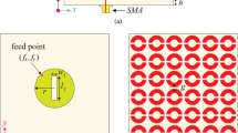 Ref. 31 reported a \(4 \times 4\) SIC array achieving an impedance bandwidth of 31% and a peak gain of 21 dBic, demonstrating excellent broadband high-gain CP radiation characteristics. However, the 3-dB axial ratio (AR) bandwidth of this design was only 24%. According to Ref. 32, an \(8 \times 8\) SIC array realized CP radiation through two parasitic strip patches tilted at \(45^\circ\), achieving a peak gain of 26.1 dBic. Nevertheless, its usable bandwidth remained limited at 21.72%, which is still insufficient. Ref. 33 proposed a \(2 \times 2\) SIC CP antenna array that achieved a usable overlapping bandwidth of 35.4% using only two dielectric substrate layers, exhibiting outstanding integration and broadband performance.Despite these achievements, the XPD values reported in Refs. 31,32,33 were below −15 dB, −18 dB, and − 20 dB, respectively, indirectly reflecting strong inter-element coupling. Although these values meet basic application requirements, there remains significant potential for further improvement to achieve purer CP radiation characteristics.