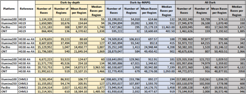 Table 2 Dark bases and regions with supplementary read inclusion. When comparing this table to Table 1, dark regions and bases are mostly decreased across the board.