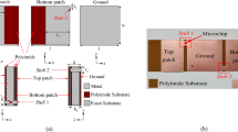In the absence of metallic objects, the resonator operates with minimal resonant coupling effects. The circular patch section without a ground-conducting plane has the electric field distributed around the circular patch as shown in Fig. 3a. This field distribution ensures efficient energy transfer between the input and output terminals. Furthermore, the transmission properties of the resonator were examined in the presence of external metallic objects, as depicted in Fig. 3b. Three distinct scenarios were evaluated: a metallic backplane configuration resonating at approximately 380 MHz, a metallic plate positioned at \(h = 1~\text {mm}\) resonating around 1.22 GHz, and a metallic plate at \(h = 10~\text {cm}\) exhibiting shallower dips, indicating diminished interaction with greater distance. These observations highlight the resonator’s responsiveness to the proximity and presence of metallic objects.