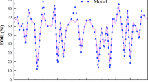 Upon entering the sandstone core, the shear rate dropped sharply to about 2.16 s⁻¹, as estimated using the Cannella correlation59. At this lower shear rate, the polymer exhibited substantial structural recovery, with its viscosity increasing more than 10-fold to approximately 25 cP, as confirmed by the down-curve in Fig. 14. This quantitatively confirmed resilience against shear degradation ensures that the polymer regains sufficient thickening power under core-scale flow conditions. This behavior, combined with BSG’s inherent salinity tolerance and low rock adsorption, sustained a favorable mobility ratio, reduced water channeling, and contributed directly to the observed improvement in sweep efficiency and incremental oil recovery throughout the flooding sequence. The lasting effect was evident in the chase brine phase, where the water cut remained below pre-polymer levels for a substantial portion of the run.