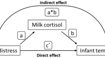 We observed a significant positive correlation between maternal and infant salivary cortisol levels at both the neonatal stage (r = 0.319, p < 0.001) and at 6 months postpartum (r = 0.208, p = 0.003), with stronger synchrony in the early postnatal period. This finding is consistent with evidence suggesting that mothers and infants exhibit physiological, emotional, and behavioral attunement from birth onward59,62,111. Such synchrony is thought to originate during gestation, when maternal and fetal systems are coupled through shared neuroendocrine pathways112. Maternal cortisol, for example, has been shown to correlate with levels in both amniotic fluid and fetal cord blood113,114, providing a route for the programming of infant stress responses. In line with this, Nazzari and coworkers115 reported that higher maternal cortisol awakening response (CAR) during pregnancy predicted a flatter infant cortisol response to stress in the neonatal period. However, findings remain mixed; in a later study, antenatal diurnal cortisol levels were not associated with stress reactivity in 3-month-old infants116. Collectively, these results suggest that maternal–infant physiological coupling is dynamic and may be strongest immediately after birth, potentially shaped by both prenatal exposures and early caregiving contexts.