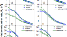 An explanation for the low field sensitivity of the relaxation rate can be provided as follows. The NMRD profiles at low frequencies are most sensitive to the slow dynamics of the surface water where \(R_1(f)\) is approximately proportional to the surface-to-volume ratio x. See Eqs. (1) and (2). At the lowest frequency of 0.01 MHz, \(R_1(f)\) decreases with increasing tumour fraction c primarily because x decreases with increasing c (Fig. 3).