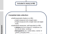 Two trained technicians collected musculoskeletal abnormalities data. For intra-observer assessment, the musculoskeletal abnormalities measurements were taken on 2% of study sample (9 participants) in the present study (chosen randomly)18. Both technician measured each participant’s abnormality three consecutive times within 1 h. For interobserver assessment, a complete set of musculoskeletal abnormalities measurements was taken on 9 participants (chosen randomly). Both technicians measured the same participant once. The interobserver reliability investigation was performed on a separate day from the intraobserver reliability test18. Technical error of measurement (TEM) was used to calculate a reliability coefficient (R)19. The reliability coefficient of more than 0.8 indicated the appropriate precision of the measurements20. For actual measurement, the supervising researcher assessed the musculoskeletal abnormalities of 10% of each technician’s sample to ensure accurate measurements. If at least two of the three measurements were correct, the measurements were considered accurate21.