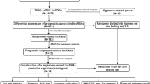 The lncRNA expression matrix was screened from the RNA-sequence data based on reference annotation for the human genome from GENCODE. 11 migrasome-related genes were identified from previously published studies (Supplementary Table 1)18,19,20,21,22,23. Then, to identify migrasome-related lncRNAs, correlation analysis was performed for each lncRNA with migrasome-related genes. The lncRNAs with correlation coefficient > 0.6 and P < 0.001 were determined as migrasome-related lncRNAs. Subsequently, we used limma to identify differentially expressed migrasome-related lncRNAs between tumoral and normal samples in TCGA COREAD cohort in R sofware (version 4.0.5). The cutoff was |log2 fold change (FC)|≥ 1.0 and false discovery rate (FDR) < 0.05.