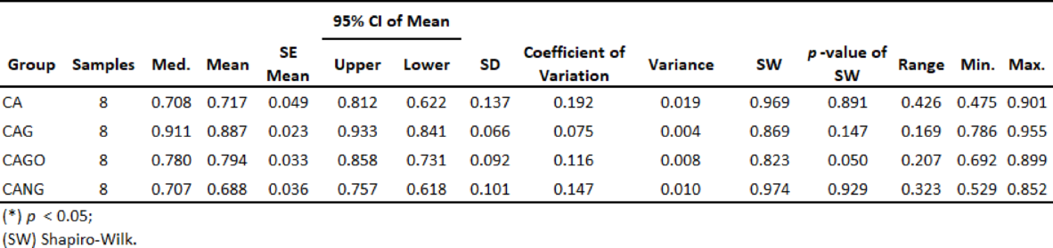 Table 2 Descriptive Analysis with each group Confidence Interval (CI), Standard Deviation (SD) and Variance. Shapiro-Wilk check confirmed groups values homogeneity.